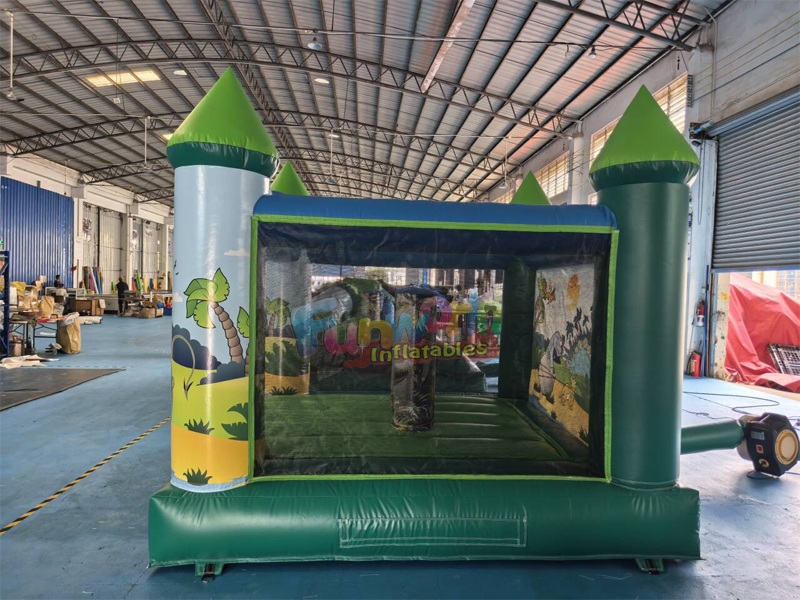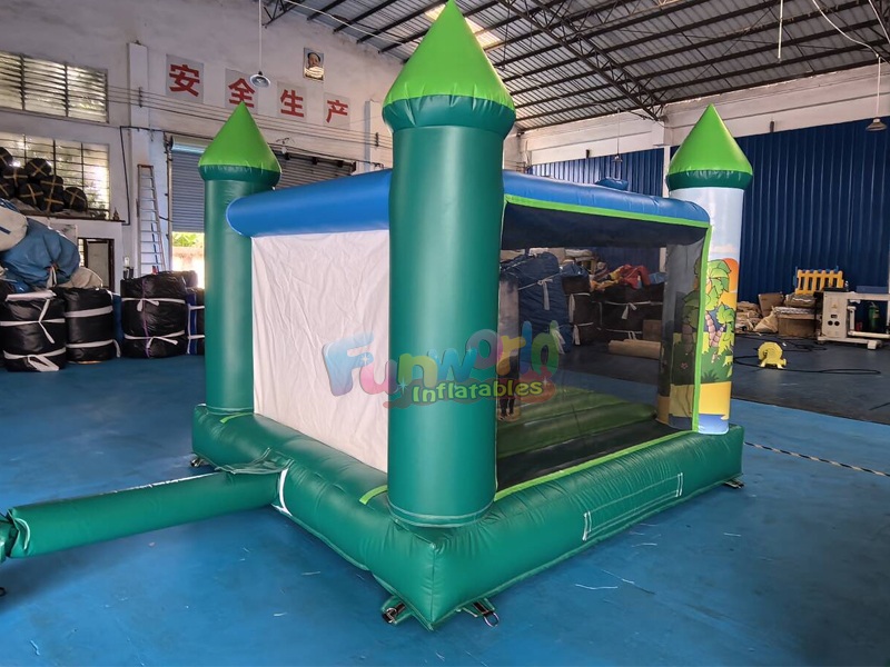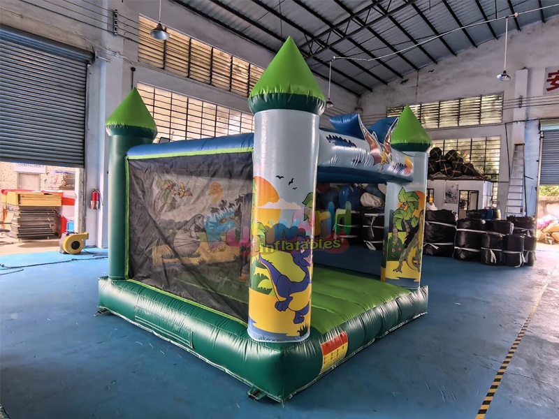 Надувной батут в виде динозавра опирается на четыре прочные башни, увенчанные изумрудно-зелеными коническими башенками, что придает ему величественный, похожий на крепость силуэт. Внешний вид представляет собой настоящее визуальное пиршество, украшенное высококачественной цифровой графикой дружелюбных, мультяшных динозавров.