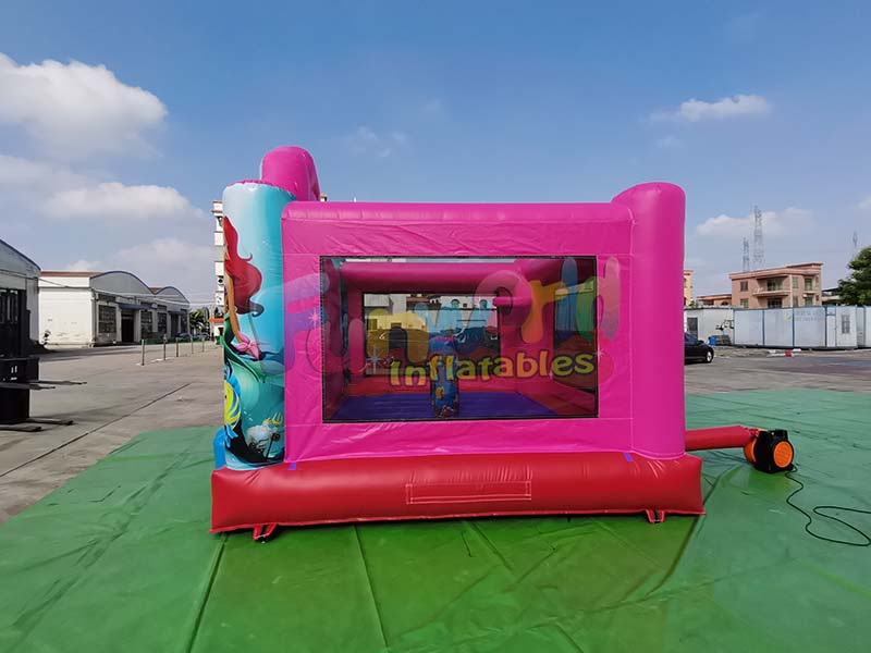 Надувной батут-замок для улицы. Стены имеют большие прозрачные сетчатые окна посередине, усиленные черными окантовочными полосами. Это обеспечивает надлежащую циркуляцию воздуха внутри, предотвращает случайное вылезание детей и позволяет родителям или присмотрящим легко следить за детьми, играющими внутри.