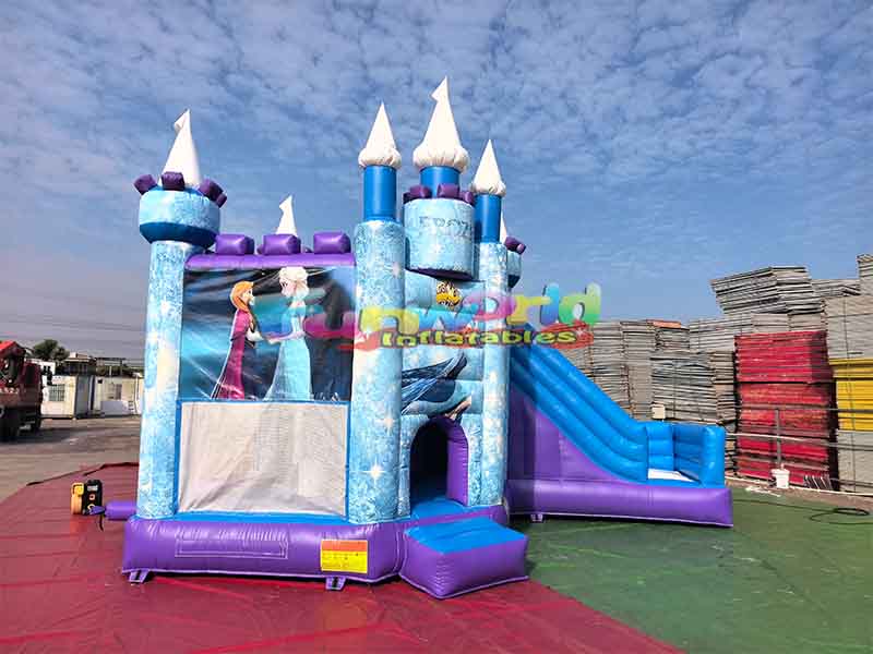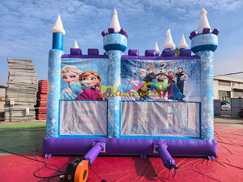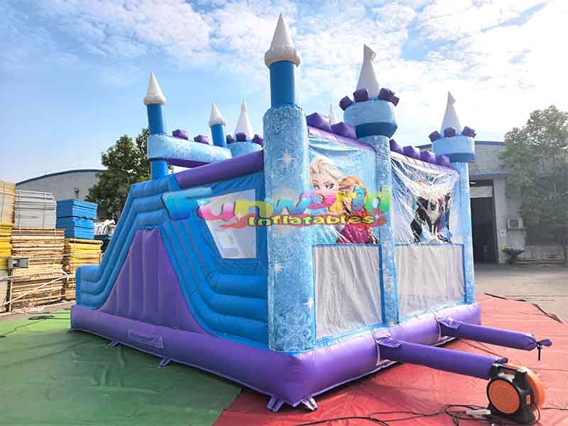 Детский надувной батутЗамок выполнен в многовершинной форме, с белыми шпилями на вершинах башен, фиолетовыми украшениями и синими колоннами, дополняющими трехмерную структуру башен и воссоздающими стиль замка из мультфильма. С одной стороны замка прикреплена надувная горка сине-фиолетовой цветовой гаммы, плавно перетекающая друг в друга.