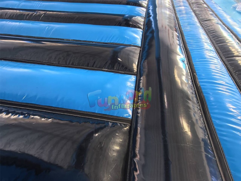 Этот гигант надувной батутный замокe Отличительной чертой является эффектная сине-черная цветовая гамма с глянцевой отделкой. Конструкция включает в себя высокие, похожие на крепостные стены, стены и четыре угловых столба, каждый из которых увенчан конической остроконечной башенкой, что придает ей классический замковый вид. В комплект входит большая, усиленная площадка для прыжков с ребристым надувным полом, разработанным для долговечности и максимальной отдачи.