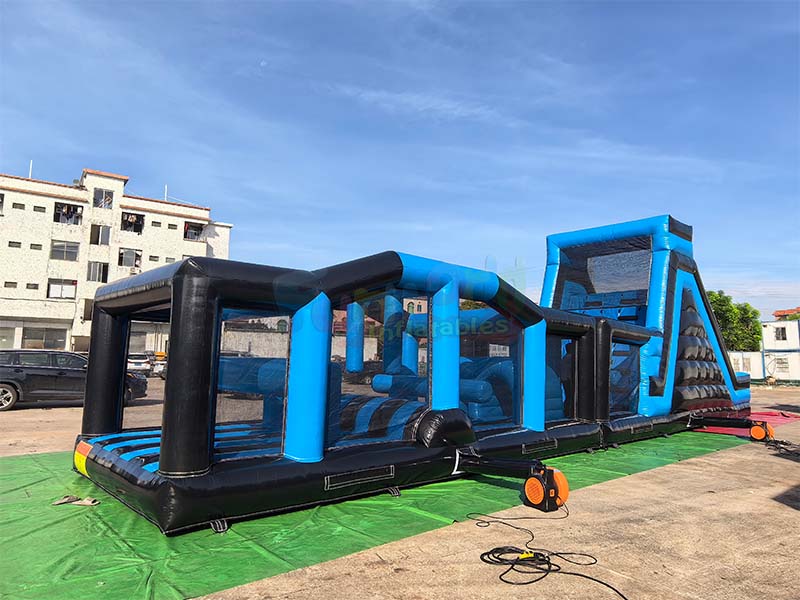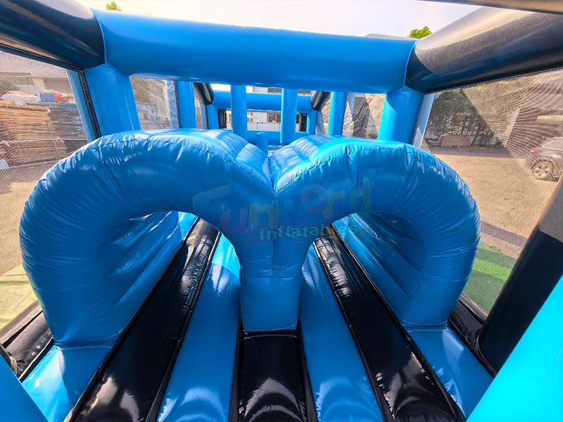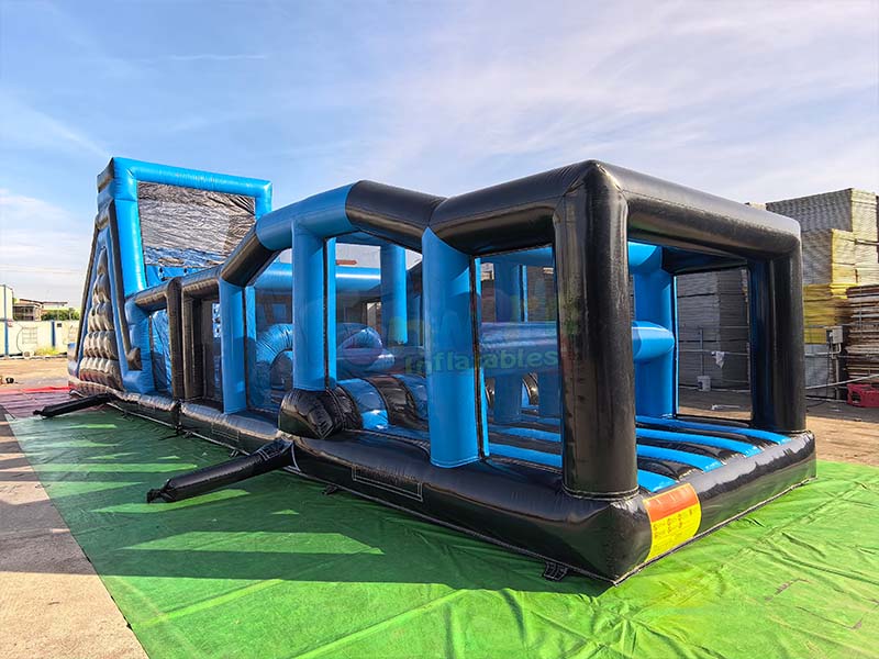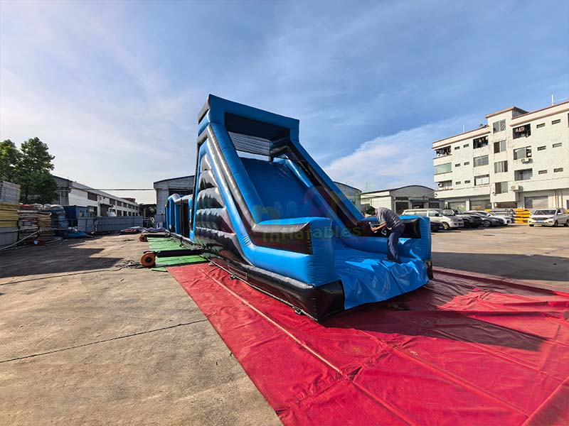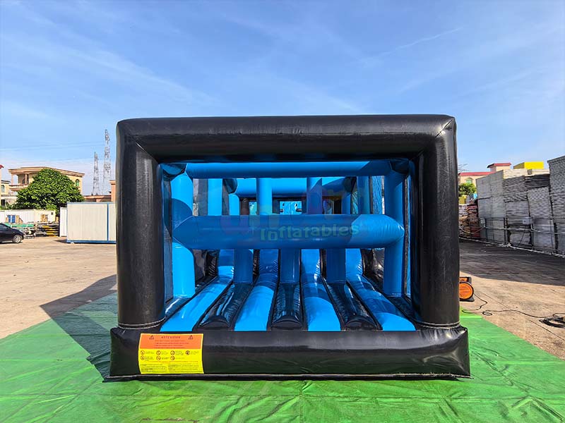Гигантская надувная полоса препятствий Отличается квадратной рамой с утолщенными черными надувными стойками и ярко-синим наполнителем на входе, дополненным прозрачной сетчатой поверхностью. Резкий контраст между черными и синими блоками повышает узнаваемость, сохраняя при этом визуальную открытость. Полоса препятствий включает в себя изогнутые надувные препятствия с мягкой, эластичной структурой с чередующимися синими и черными полосами, которые придают динамичный изгиб жесткому каркасу. Возвышающийся пандус покрыт черным рельефным противоскользящим покрытием с ярко-синей окантовкой, подчеркивающей его контуры. Верхняя часть оснащена квадратной синей надувной рамой, которая визуально перекликается с передней рамой, создавая чистые и динамичные линии.