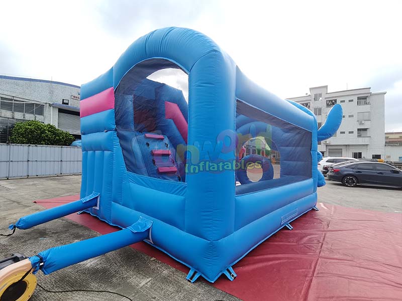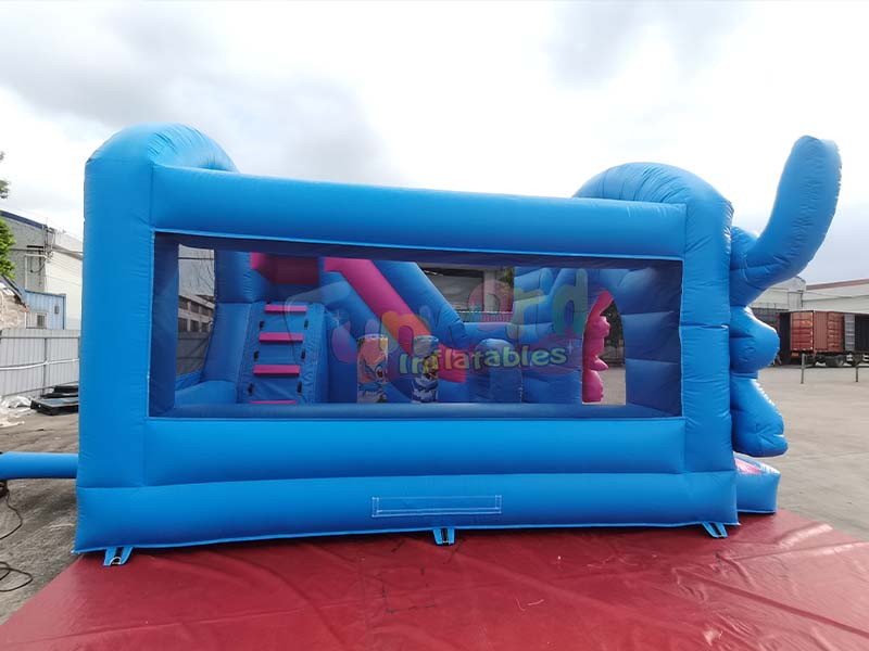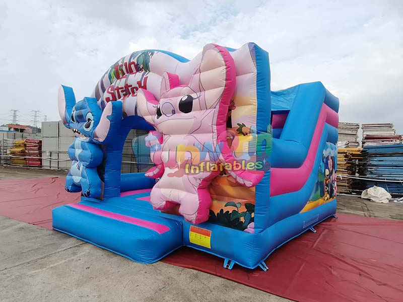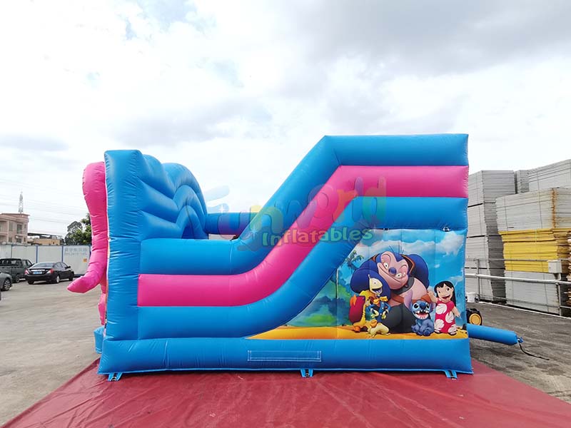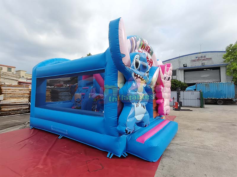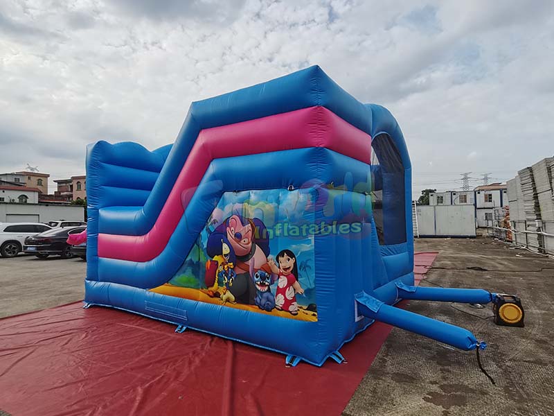 Stitch themed inflatable playground trampoline bounce house prominently features the ip characters Stitch and Angie from Lilo and Stitch, whose visually appealing designs are three dimensional, lifelike, and instantly evoke children's love for the animated ip. The vibrant color scheme, primarily bright blue with large areas of pink accents, creates a strong visual impact and a playful, childlike feel, making it highly recognizable in outdoor settings. The structure is rich in detail, integrating a trampoline area with a blue and pink slide. The sides are also printed with various animated scene patterns, giving the exterior both a complete IP theme and a layered play area.