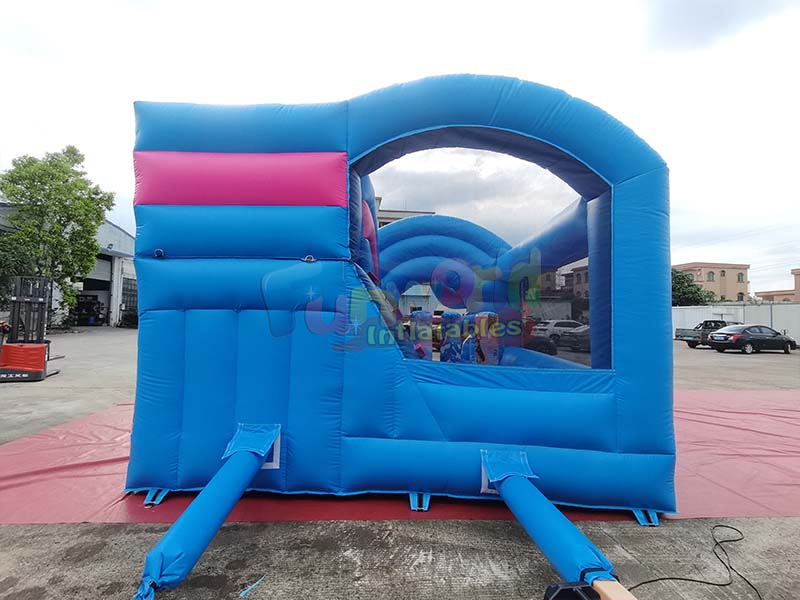 Inflatable professional bounce house.The stitching at the seams of the inflatable components is fine and sturdy. The joints between the ring structure and the main body, as well as the connections between the cylindrical components, are solidly crafted to prevent leaks and ensure long-term structural stability.