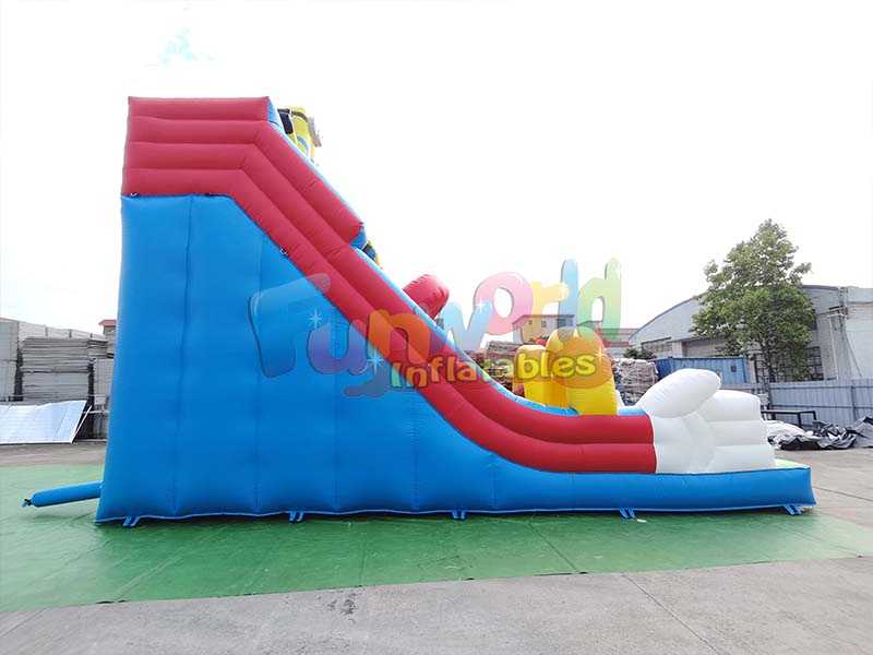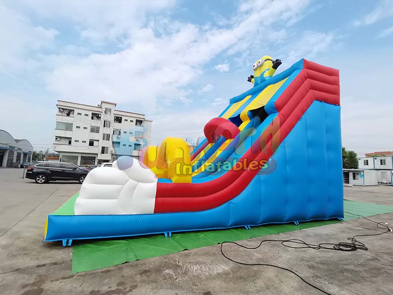 Большая надувная горка Детский и игривый дизайн. Верхняя часть украшена очаровательным персонажем мультфильма Миньоном с круглым жёлтым телом в синем комбинезоне, большими яркими глазами и вытянутыми руками. Цвета насыщенные и ритмичные. По центру проходит белоснежная горка, обрамлённая яркими красными арками. Зоны для лазания по обе стороны горки выполнены в контрастных цветах. Нижняя зона амортизации выполнена из надувного материала с градиентом от зелёного к жёлтому, что обеспечивает безопасное и комфортное скольжение.