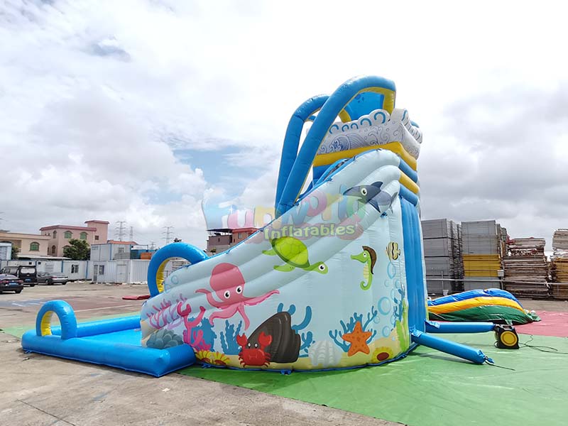 Дешевая большая надувная водная горка Визуально привлекательный и яркий, он создаёт освежающую летнюю атмосферу. Его общий дизайн напоминает водную крепость, очаровательно украшенную мультяшными элементами сверху, что добавляет немного детской игривости. Многочисленные горки спускаются с высоты, предлагая захватывающие водные приключения. У основания расположен большой синий надувной бассейн, гармонично вписывающийся в общий дизайн. Изящные округлые надувные конструкции, окружающие воду, усиливают трёхмерность сооружения, создавая нежную и игривую атмосферу.