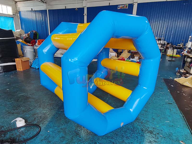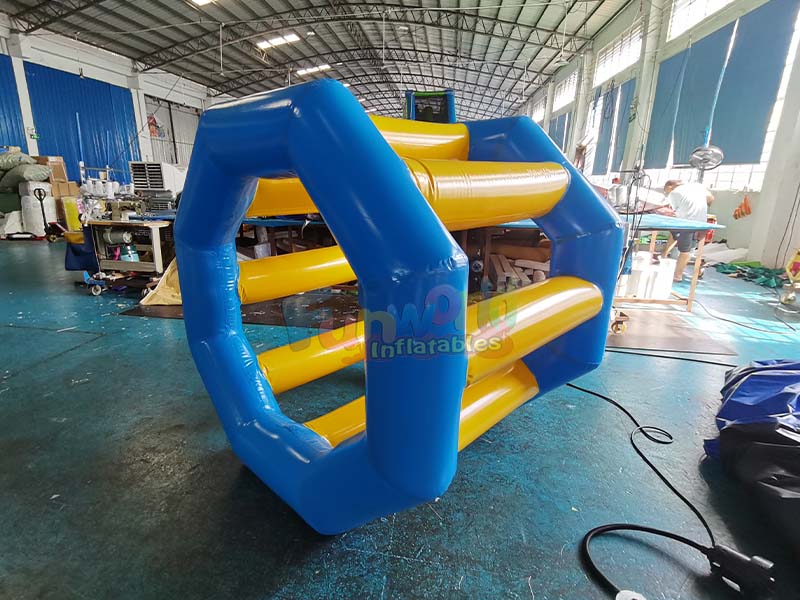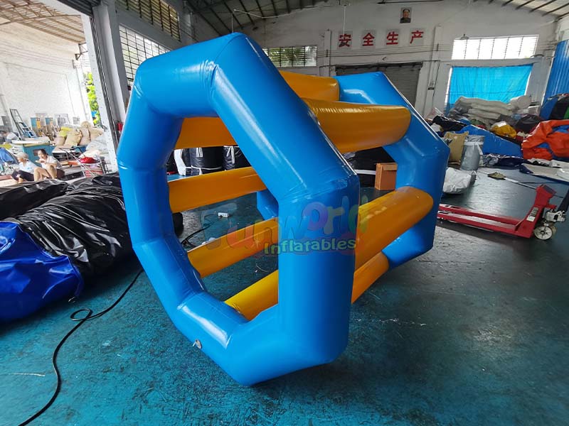Надувной игровой аттракцион «Водный ролик» имеет синюю восьмиугольную надувную раму правильной формы с богатым дизайном. Он не только повышает устойчивость конструкции, но и образует уникальное интерактивное пространство, делая игру насыщенной и интересной.
