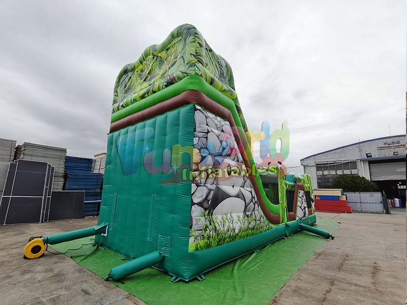 Панда надувная горка для животных Создаёт насыщенную атмосферу джунглей. Оборудование украшено несколькими очаровательными чёрно-белыми пандами, что добавляет ему очарования. Реалистичные узоры из джунглей и мультяшные текстуры камней создают ощущение естественности и игривости. Его яркий внешний вид легко пробуждает любопытство и вызывает восторг у детей.