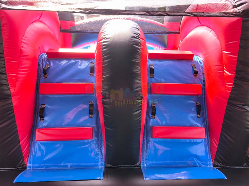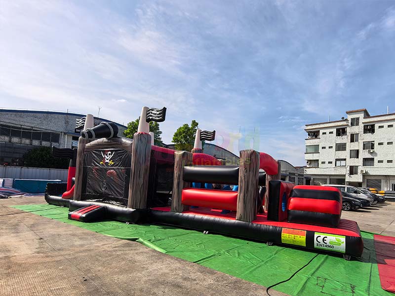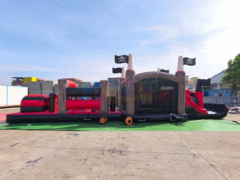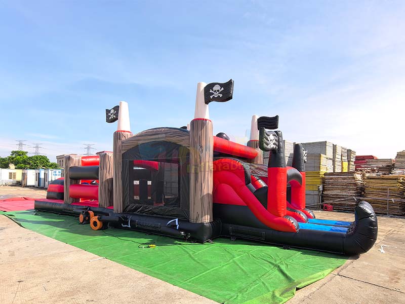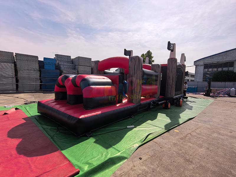 Комбинированный надувной батут для влажной и сухой ездыВ оформлении преобладают яркие красные и изысканные черные тона, дополненные надувными колоннами с имитацией темно-коричневой древесной текстуры. Цветовой контраст впечатляет и идеально передает ретро-атмосферу пиратской тематики. Многие колонны увенчаны белыми шпилями и черными флагами с черепами и скрещенными костями, их дизайн привлекает внимание и выдержан в едином стиле. Некоторые колонны также включают черные надувные декоративные элементы, еще больше усиливая пиратскую атмосферу благодаря тщательной проработке деталей.