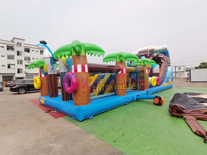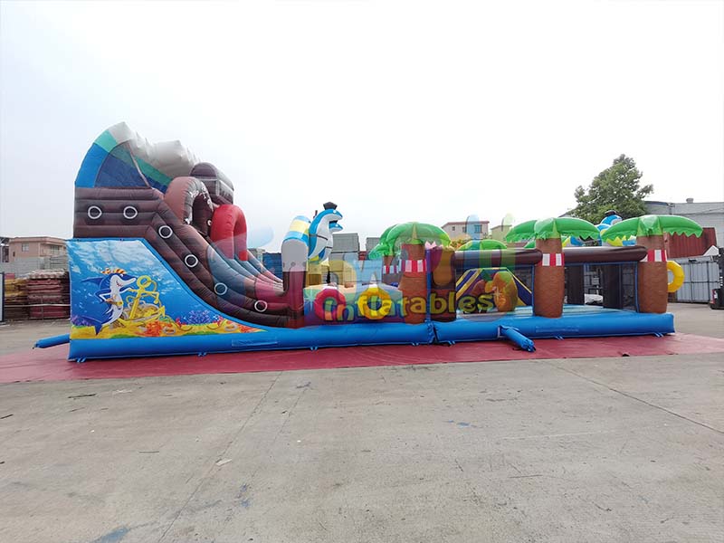 Пиратская тематика большая надувная горка, с его синим фасадом, сочетает в себе элементы тропического острова и пиратских приключений, создавая визуально насыщенный и причудливый опыт. Несколько пальм украшают конструкцию, как живые, с текстурированными коричневыми стволами и ярко-зелеными кронами, которые выглядят очень реалистично. Сине-белый дельфин в пиратской шляпе добавляет очарования пиратской тематике. Батут оснащен яркими интерактивными кольцами и горкой, украшенной пиратским черепом, а также элементами дизайна, напоминающими пиратский корабль. Общая конструкция включает в себя батутную зону, полосу препятствий и модули горок, выполненные в разнообразных цветах и ярких формах, создавая захватывающую игровую среду приключений на пиратском острове и предоставляя детям интерактивное пространство, полное воображения и радости.