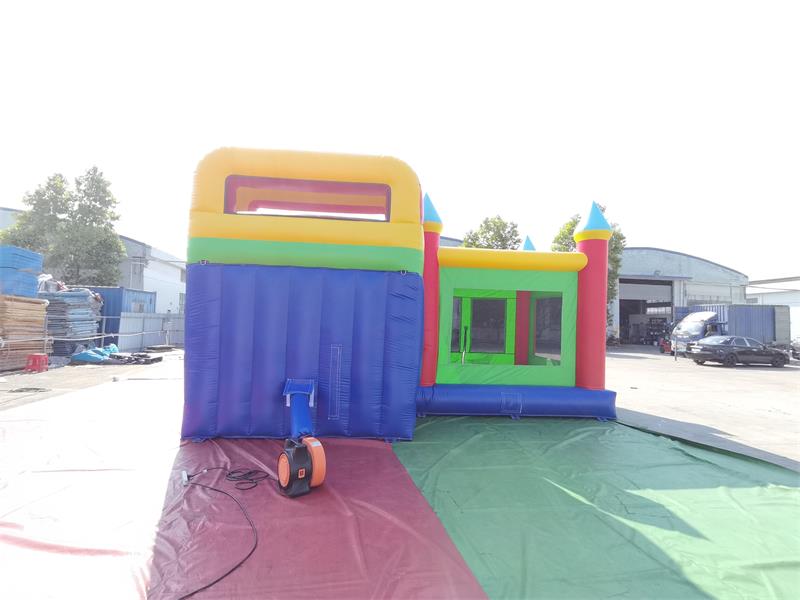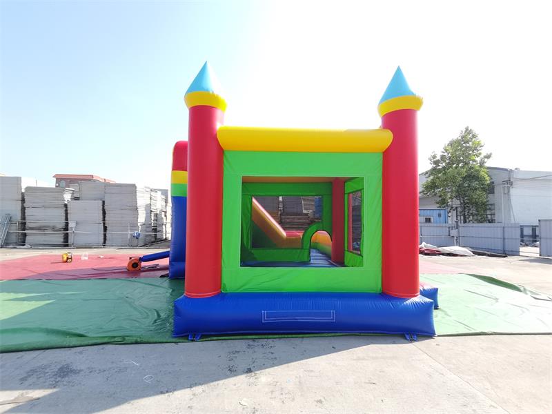 Коммерческий комбинированный надувной батутБатутная зона, выполненная в классическом стиле сказочного замка, имеет три остроконечные башни, поддерживаемые прочными красными надувными колоннами и увенчанные светло-голубыми коническими шпилями. Между башнями встроены зеленые прозрачные сетчатые окна, сохраняющие волшебную атмосферу замка. С правой стороны находится двухуровневая горка; внешний слой горки покрыт чередующимися красными и желтыми полосами, а внутренний слой — ярко-голубого цвета, с краями, очерченными ярко-желтыми линиями.