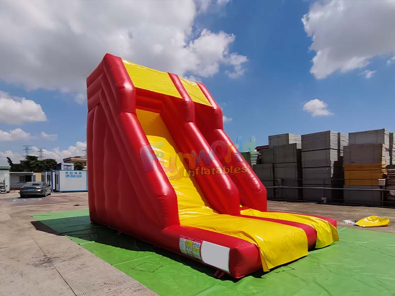 Жёлтая гигантская надувная горка имеет жёлтую амортизирующую зону в нижней части, которая плавно соединяется с красным основным корпусом и обладает достаточной толщиной, обеспечивая надёжную амортизацию при скольжении. С правой стороны устройства расположены жёлтый насос и чёрная трубка для накачивания, что создаёт простую и удобную конструкцию, обеспечивающую эффективное и удобное надувание. Рационально распределённые воздушные камеры в конструкции обеспечивают сохранение стабильного наклона и формы горки после надувания. Каждая деталь демонстрирует тщательное внимание к выбору материалов, мастерству изготовления и функциональному дизайну.
